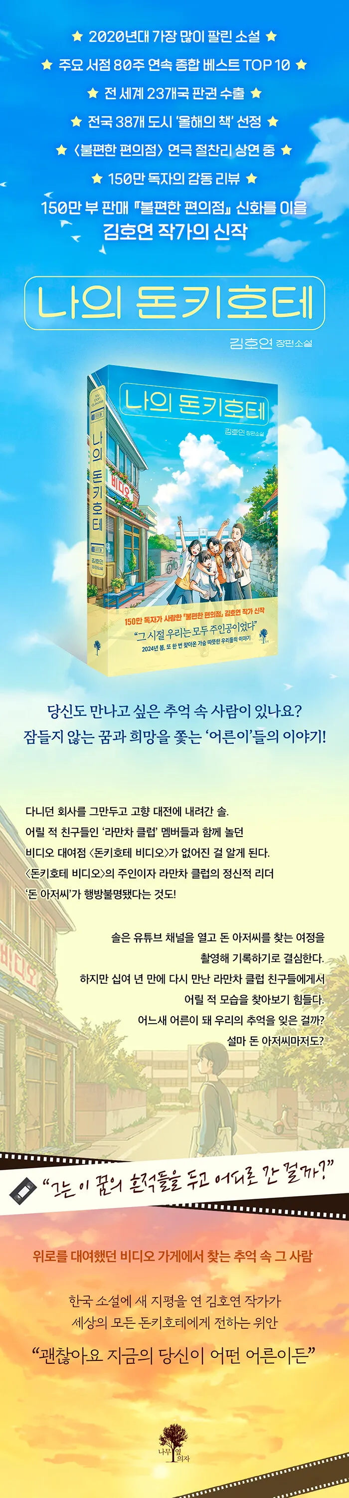다행히도, 우리는 이 이야기의 결말은 이미 잘 알고 있다. 그는 돌아와 180만 부 이상을 판매하고, 해외 25개국과 판권을 계약한 국제적인 베스트셀러 작가가 됐다. “소설 쓰기를 포기하려던 소설가”가 세계적인 베스트셀러를 써내기까지 어떤 일이 있었을까? 김호연 작가는 스페인에서의 세 달 동안 무엇을 보고, 무엇을 겪으며 다시 앞으로 나아갈 희망을 얻을 수 있었을까? 창작에 괴로워하면서도, 불확실한 미래에 생계를 걱정하면서도 돈키호테처럼 꿈을 포기하지 않은 무명작가가 꿈을 좇아 떠나게 된 과정과 그 결말을 기록한 이 여행 에세이는 현실에 지쳐 꿈을 포기한 이들에게 그 무엇보다 다정하고도 열렬한 응원이 되어줄 것이다.